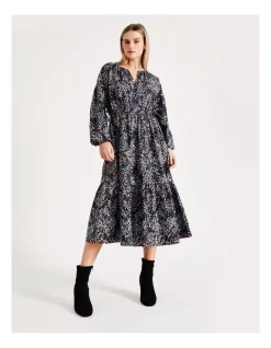 Go from day to night in a fashion-forward tiered midi dress. This dress has a flowing, tiered design with 3/4 length sleeves and an all-over print. Comfortable yet chic, this dress is a wardrobe must-have.