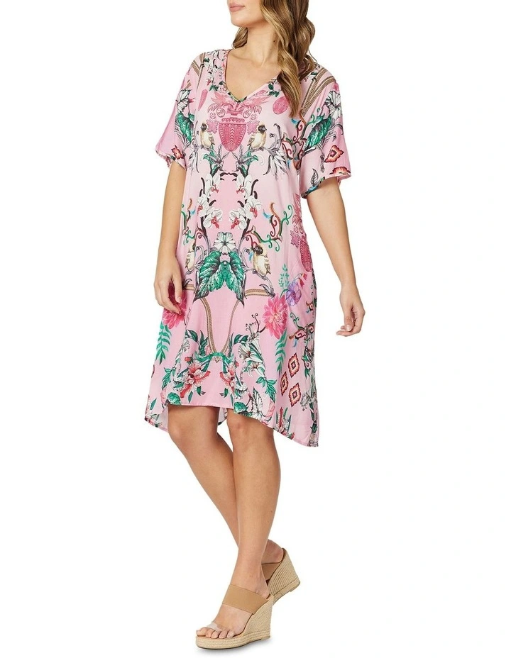 Get ready for the compliments in the Tea Garden V Neck Dress by Hammock & Vine. Styled in their signature viscose fabric with a stunning colourful all over placement print design, with floral and bird details that make this a unique and special piece.