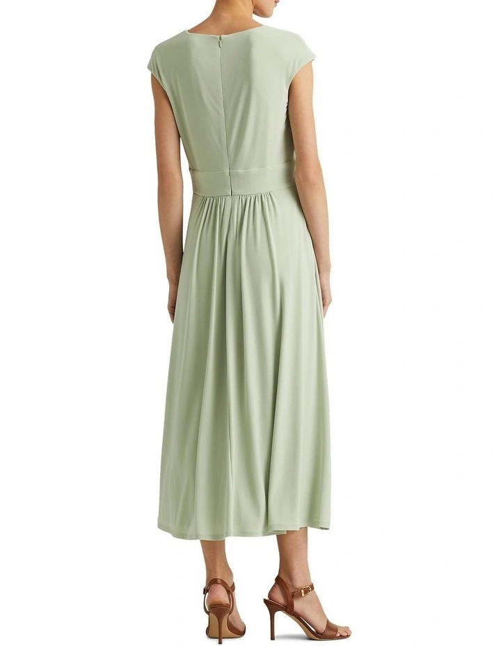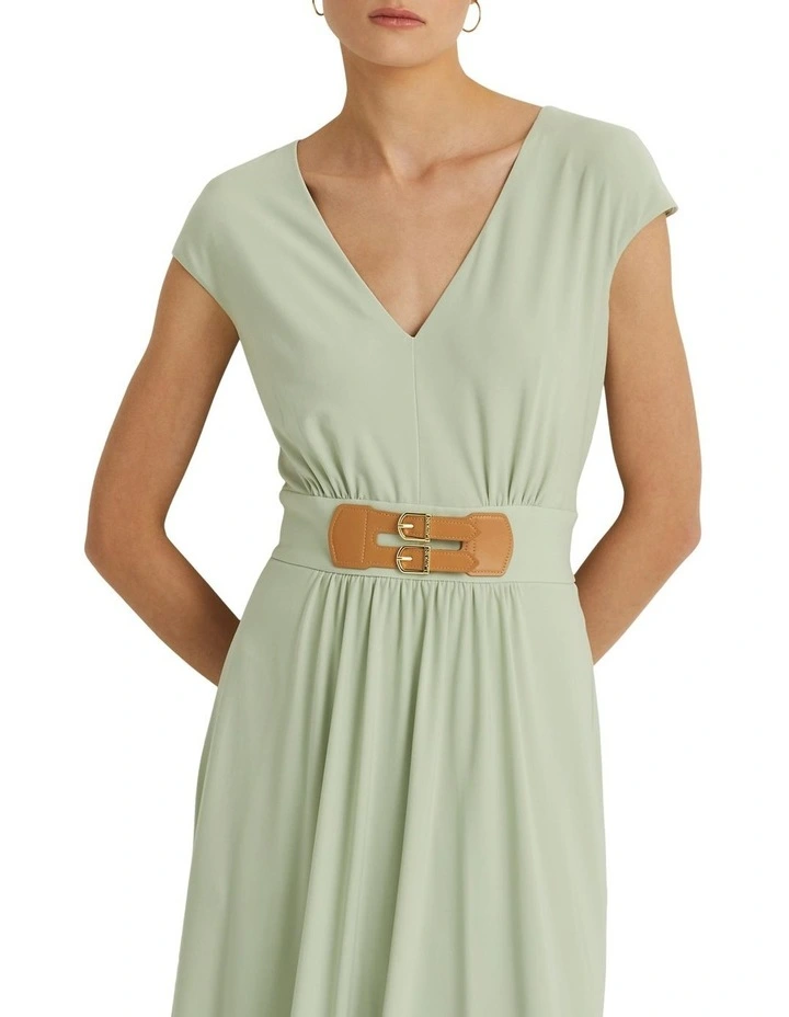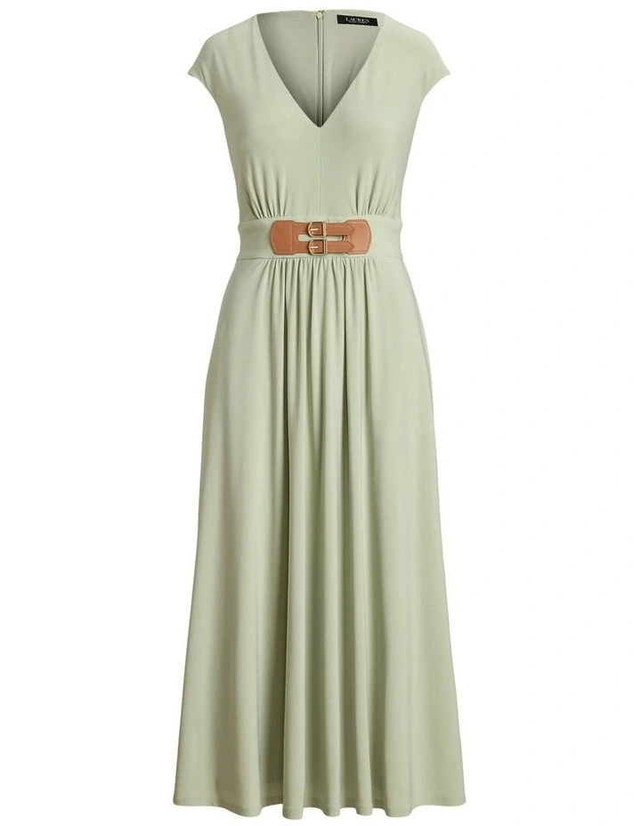 Breezy and effortless, this calf-grazing dress is crafted from stretch-infused matte jersey accented with a faux-leather buckled tab at the waist. Short sleeves and side on-seam pockets bring a casual feel to its sophisticated silhouette.