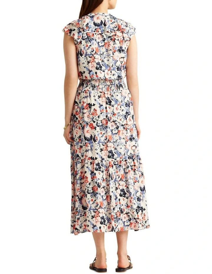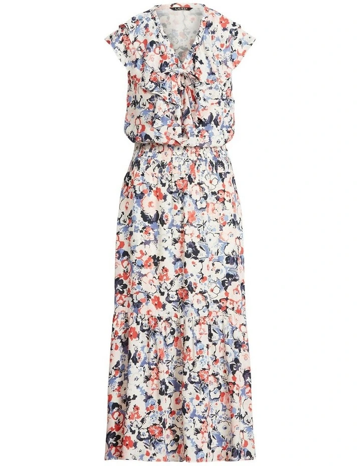 A summertime staple, this dress is crafted from delicately draped georgette and features ruffle trim, neck ties, and an intricate floral motif.