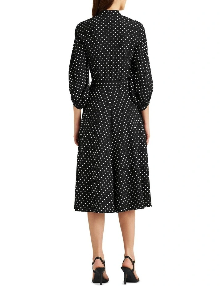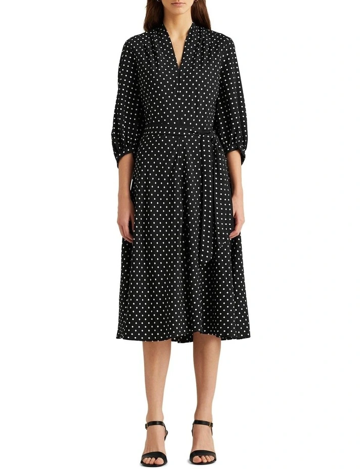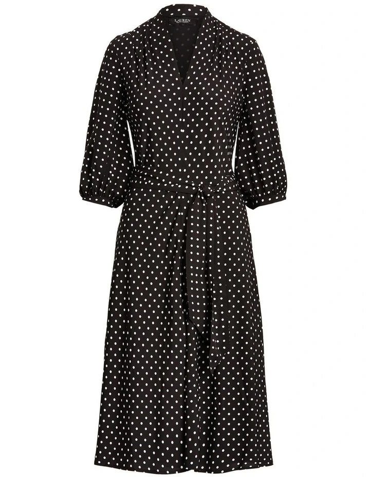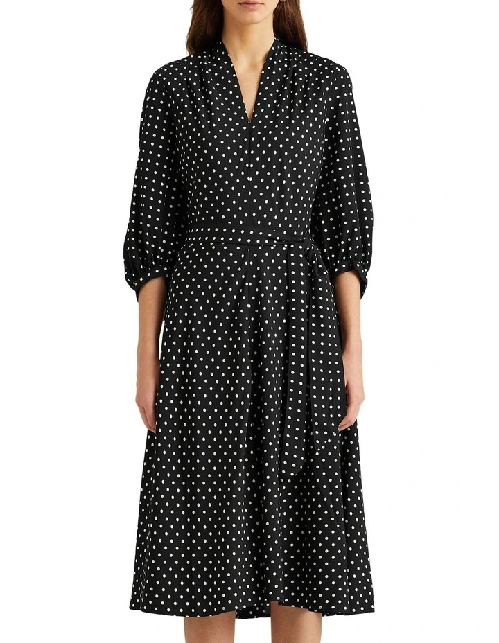 This chic polka-dot dress is designed with voluminous bishop sleeves and a pleated neckline. A self-belt brings definition to the waist, while its lightweight crepe fabrication enhances the movement of its fit-and-flare silhouette.