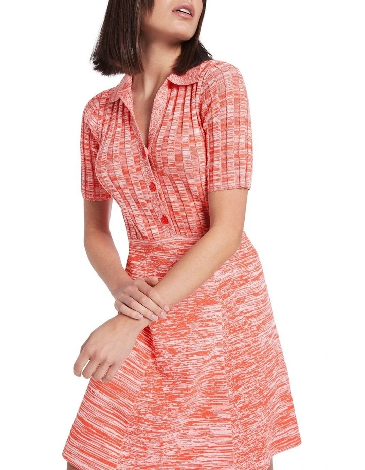 Fun and flirty in fiestaΒ red, this knit dress reveals flattering fit-and-flare shaping within a slim fit bodice and flared A-line skirt. Using a two-tone yarn to create a dappled melange effect, the dress is completed by a statement button closure to the waist, a soft rib collar, and textured wide rib detailing through the bodice and mid-length sleeves.