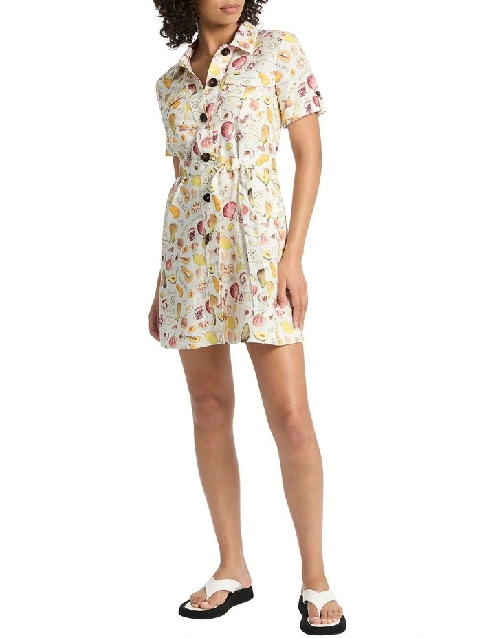 Drawing in at the waist with a fabric self-tie belt, this pure linen dress delivers relaxed shaping through the body, enhanced by a neat short sleeve design and a full button front fastening. Flaunting a colourful summer fruit print, the dress draws the eye to contrast button detailing, while creating further appeal in its sharp shirt collar and pockets at the chest and hip.