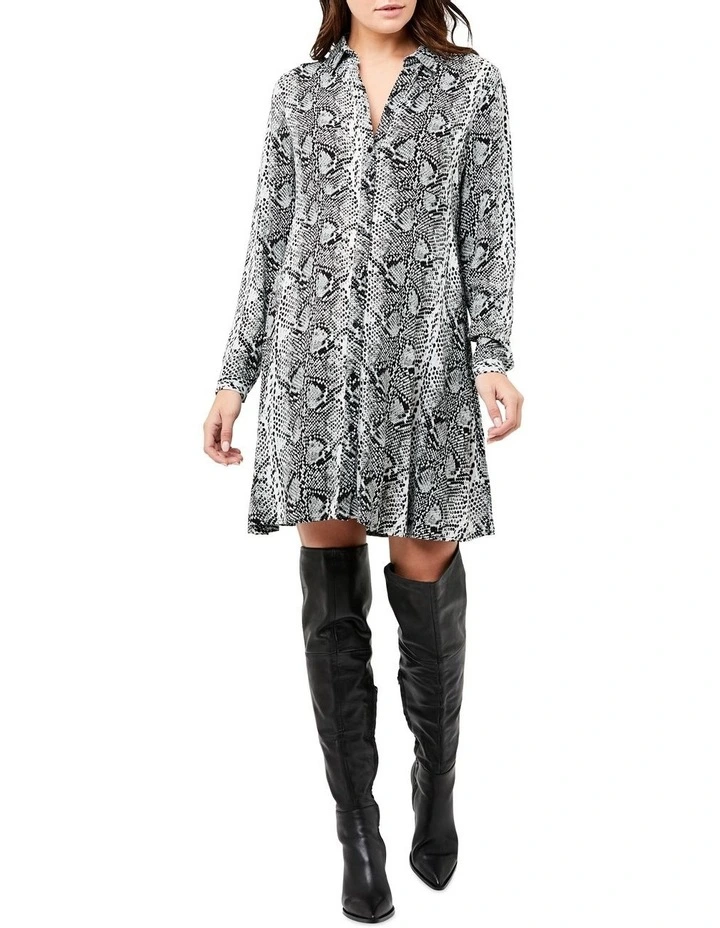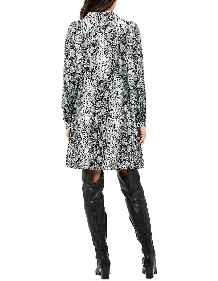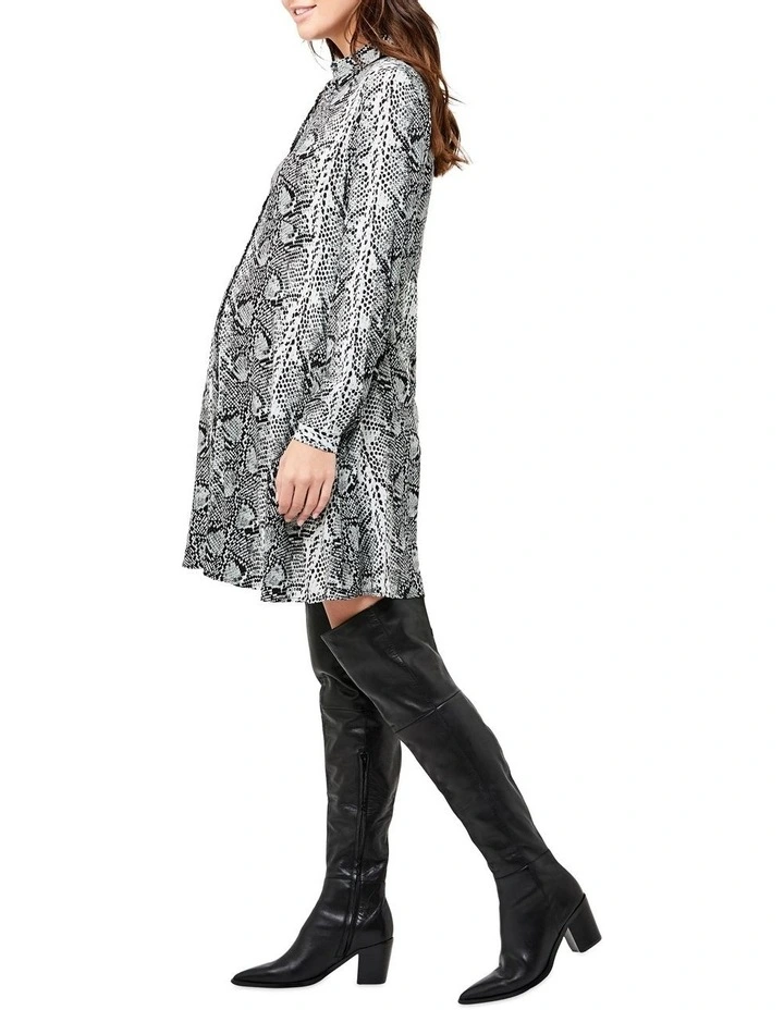 Cut from a light weight printed woven fabric, our Snake Print Shirt Dress features a button through silhouette, suitable for nursing post-pregnancy. Layer wear with knitwear and tights in the cooler months.